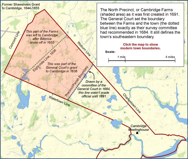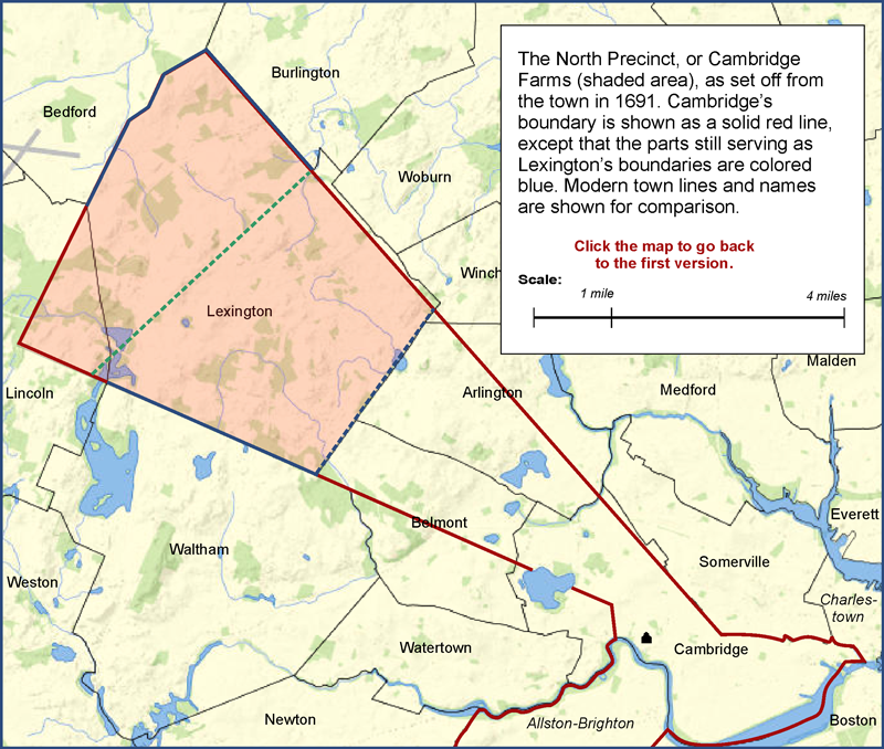 Click the map to display the version with modern town lines, and you can see that Lexington’s boundaries today are only slightly different from what they were in 1691.