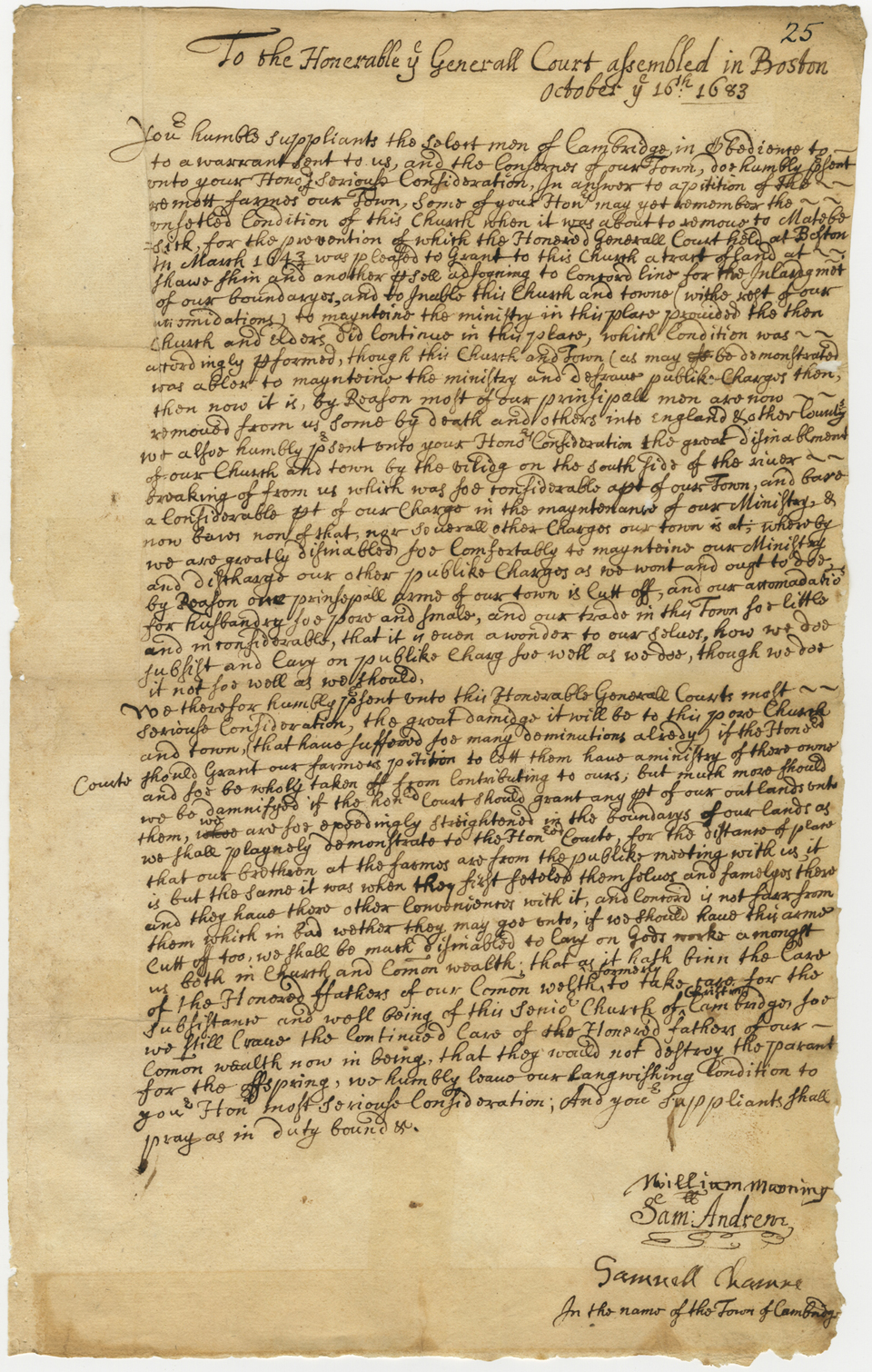The next item in order of time is the response prepared by the selectmen of Cambridge, which the General Court had the opportunity to read and consider before responding again to the Farmers’ petition. It is dated October 16th, 1683, so it’s clear that the Court hadn’t gotten around to dealing with this matter in the spring session. (Perhaps Cambridge had requested a delay—the records aren’t detailed enough to let us find out.) The petition is signed by William Manning, Samuel Andrew, and Samuel Champney (‘Chamne’). The last two were selectmen, and the first, Manning, would be one only a month later, when all three were elected to that office.